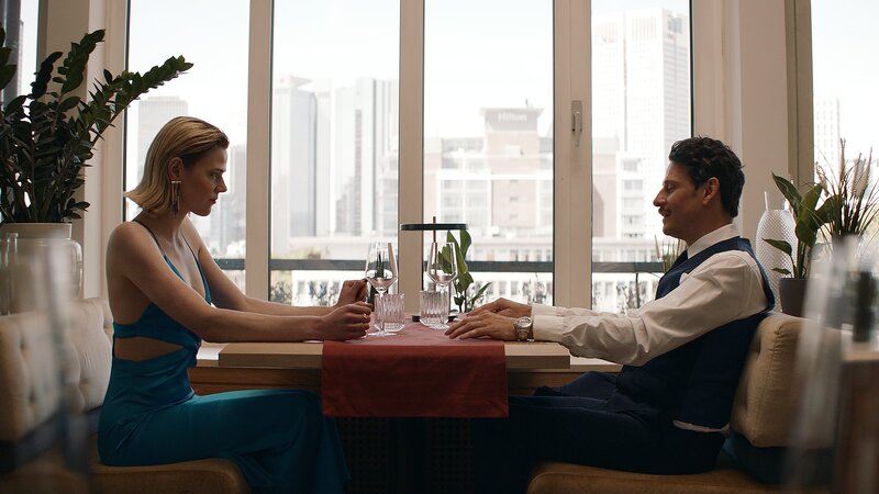 • Franzi (Llewelyn Reichman) trifft einen imaginierten Mann (Christoph Gawenda) in einem Café in Frankfurt.