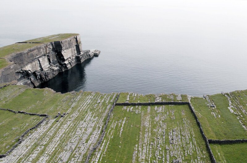 Auch der Mensch hat auf den Aran-Inseln seine Spuren hinterlassen: Neben Festungen und Hügelgräbern fallen besonders die im Schachbrettmuster angeordneten Trockensteinmauern ins Auge.