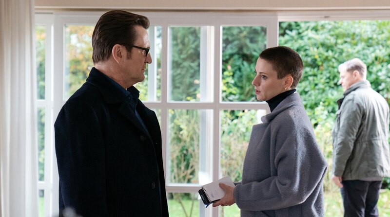 Nina (Julia E. Lenska, M.) berichtet Lars (Ingo Naujoks, l.), dass Jenny erzählt hat, dass ihr Mann bedroht wurde (mit Sven Martinek, r.).