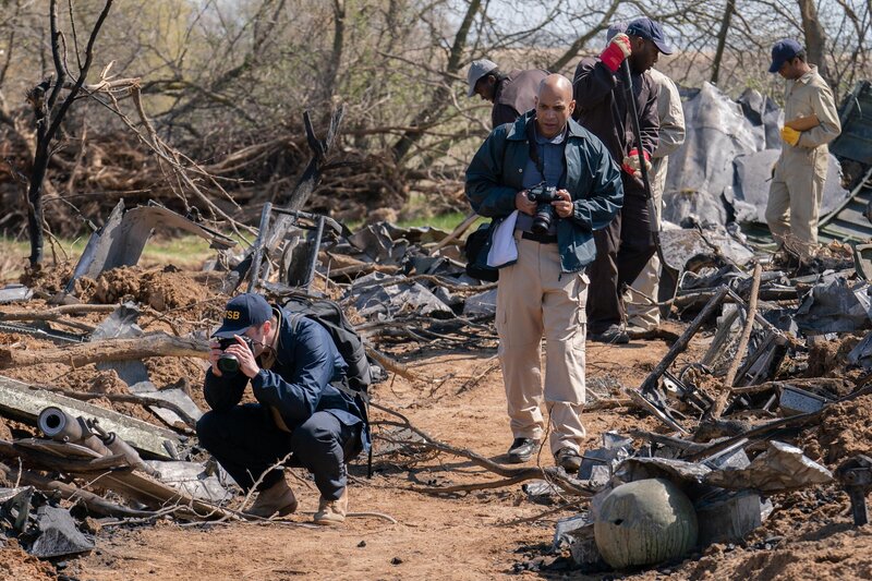 • REENACTMENT - Eric Blankenstein (gespielt von Olivier Lamarche) inspiziert das linke Triebwerk von Airline PNG Flight 1600 und stellt fest, dass es beim Sinkflug auseinandergerissen wurde; der Ermittler aus Papua-Neuguinea (gespielt von Andrew Hinkson) prüft das rechte Triebwerk.