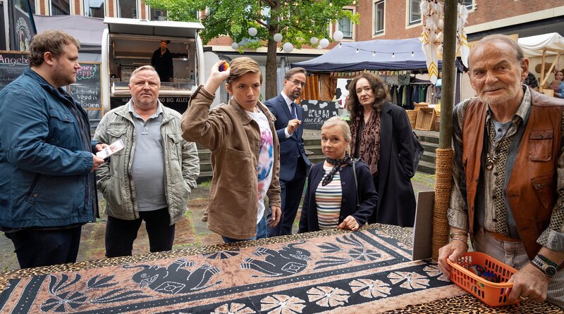 Straßenfest in Münster: Titus (Casper Gold), der Großneffe von Staatsanwältin Klemm (Mechthild Großmann) und Prof. Boerne (Jan Josef Liefers) treten im Dosenwerfen gegeneinander an. Zuschauer: Mirko Schrader (Björn Meyer), Frank Thiel (Axel Prahl), Silke Haller „Alberich“ (ChrisTine Urspruch), Staatsanwältin Klemm (Mechthild Großmann) und Herbert Thiel (Claus D. Clausnitzer).