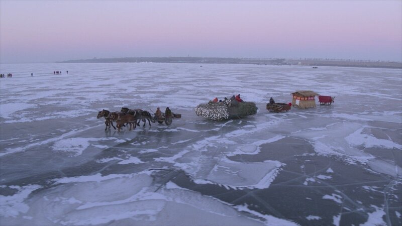 • Menschen reisen mit Pferden und Schlitten über das Eis