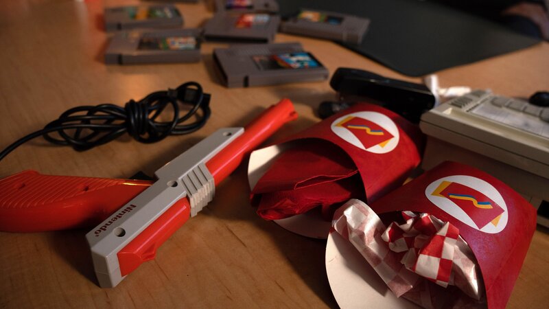 Retro-Videospiele, eine Plastikpistole und Essensverpackungen liegen auf einem Tisch.