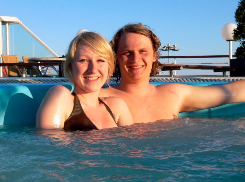 Natalia und Markus Buller beginnen ihre Hochzeitsreise im Whirlpool an Deck.
