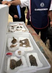 ROM, ITALIEN: Ein Offizier des Schutzkommandos des Kulturerbes der Carabinieri steht Wache neben einigen der geborgenen wertvollen Gegenstände.