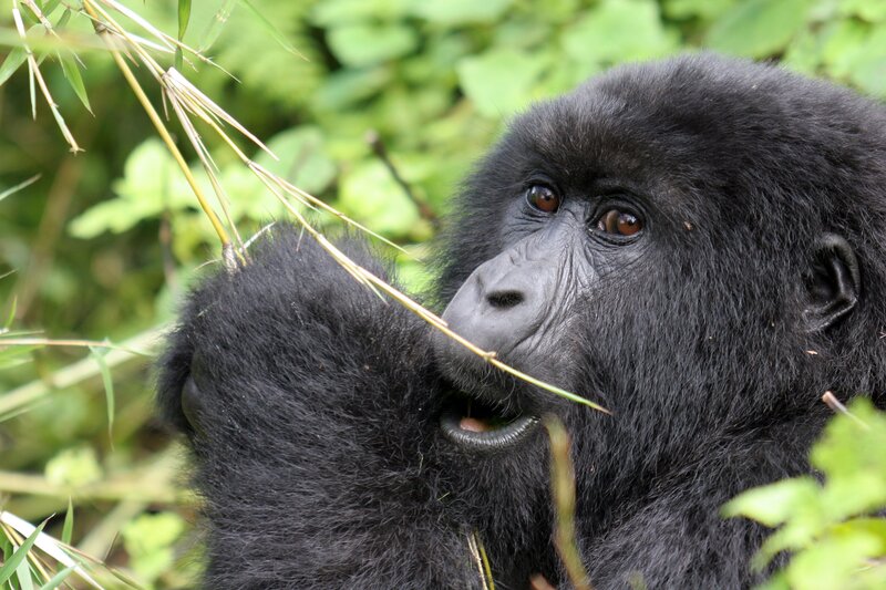 • Berggorillas entzücken durch ihre Frisuren. Das dichte Fell brauchen sie, denn im Nebelwald der Virungaberge in Grenzgebiet Ruandas zur Demokratischen Republik Kongo kann es empfindlich kalt werden.
