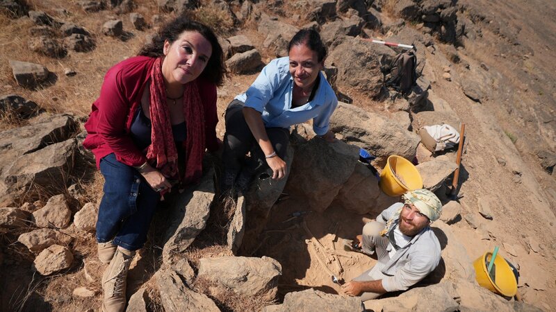 Bettany und Silvia bei den Ausgrabungen eines antiken Grabes in einer Nekropolis.