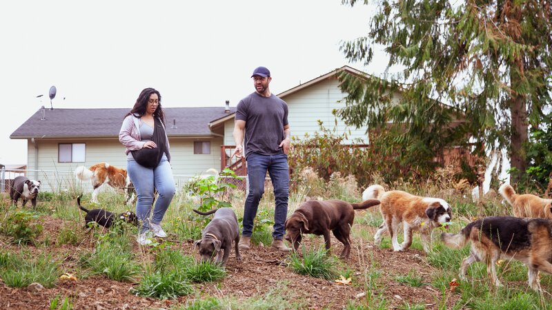 Lee Asher (r.) und Sonia Gomez (l.) machen einen Spaziergang mit dem Hunderudel.