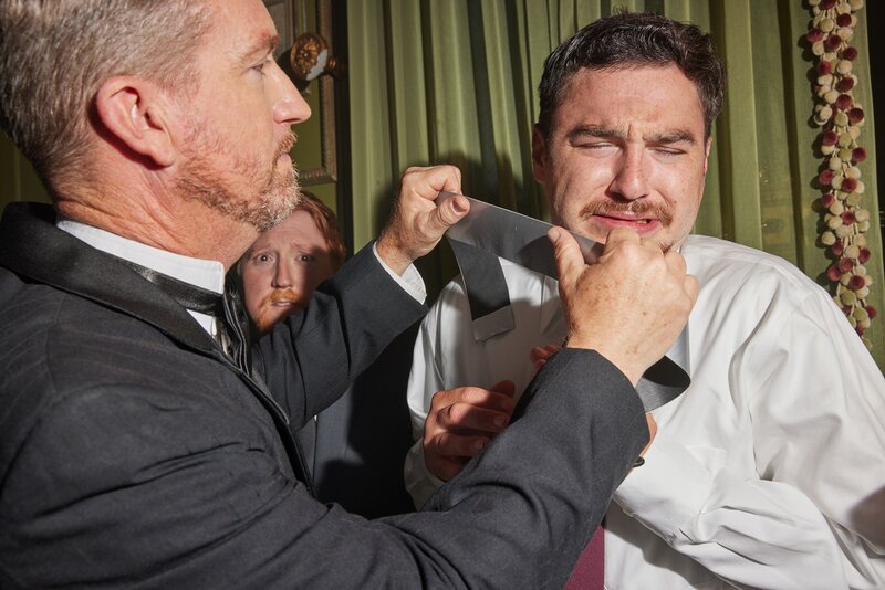 Ein Mann will den Mund eines anderen Mannes abkleben