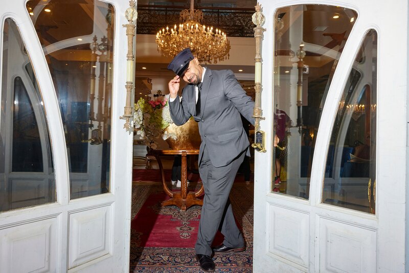 Ein Mann öffnet die Tür mit einer Verbeugung als Zeichen der Begrüßung