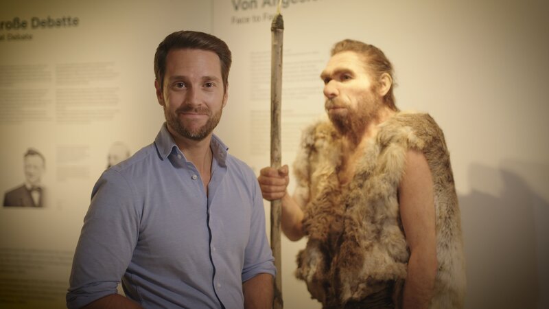 Von Angesicht zu Angesicht: Mirko Drotschmann vor einer Neandertaler-Rekonstruktion im LVR-Landesmuseum Bonn. Ein bis drei Prozent der Gene des modernen Menschen stammen vom Neandertaler.