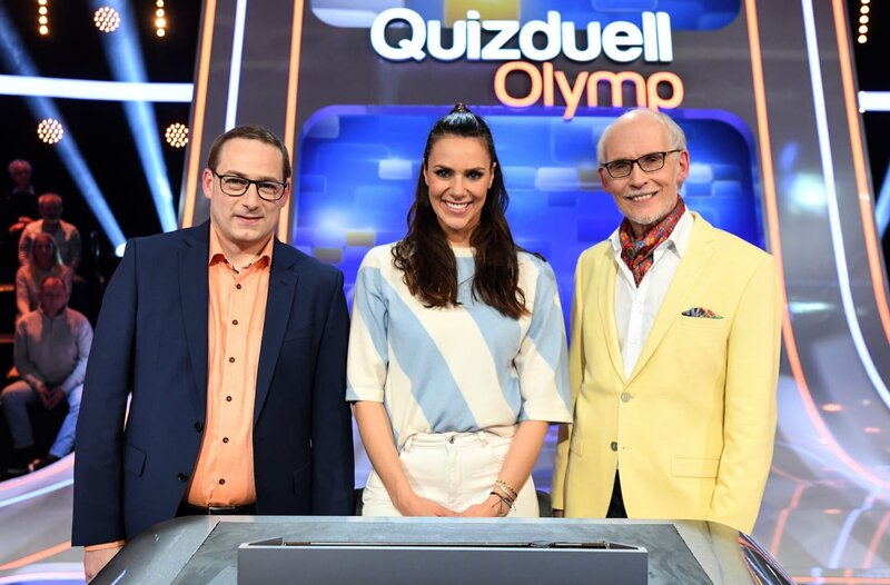 Quizmasterin Esther Sedlaczek (M.) mit den Kandidaten des Teams "Jäger": Dr. Manuel Hobiger (l.) und Dr. Thomas Kinne (l.). Bekannt aus "Gefragt-Gejagt".