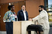 Lena (Romy Vreden, l.) und Gerhard Jäger (Markus John, M.) sprechen mit Malik Hammami (Mohammad Ahmadi, r.).