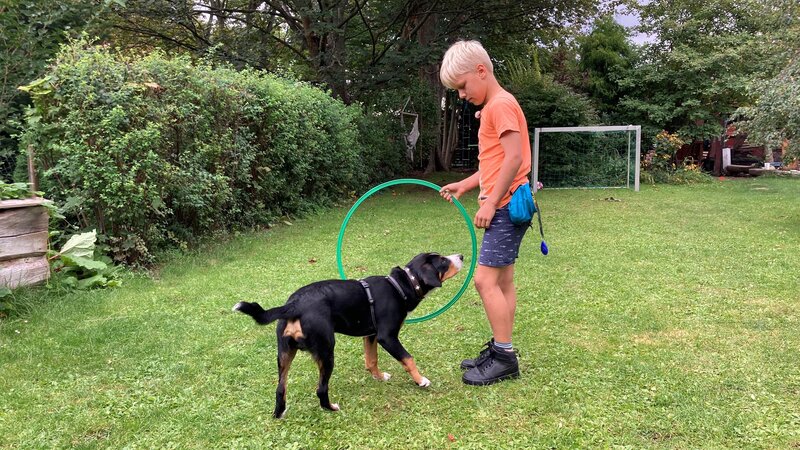 Nele und Lotte haben Hunde - Hausaufgaben auf und die erledigen sie im Garten. Es läuft ganz gut, nur eine Sache braucht Übung, Übung, Übung. Valentin und Lorelei lernen mit Bijou die "Acht" zu laufen - das ist schwierig, aber es macht Spaß und stärkt die Handführung. Am Ende von Brunos zweiter Stunde soll er Knicki durch einen Reifen führen, aber das scheint so gar nichts für Knicki zu sein. Das werden wohl die nächsten Hausaufgaben.