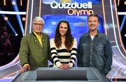 Moderatorin Esther Sedlaczek (M.) mit den Kandidaten des Teams "Schauspiel": Dem Schauspieler Christian Wolff (l.) und dem Schauspieler Hardy Krüger jr. (r.).