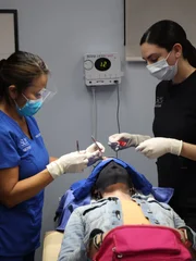 • Dr. Sandra Lee performs surgery on Krystal W.'s forehead cyst with the aid of her assistant, Janet C.
