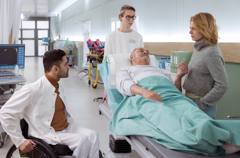 • Dr. Ina Schulte (Isabell Gerschke) und Dr. Philipp Brentano (Thomas Koch) haben gerade erfahren, dass Sarah Marquardt und Philipps Frau Arzu mit einer Hochschwangeren im Fahrstuhl stecken geblieben sind.