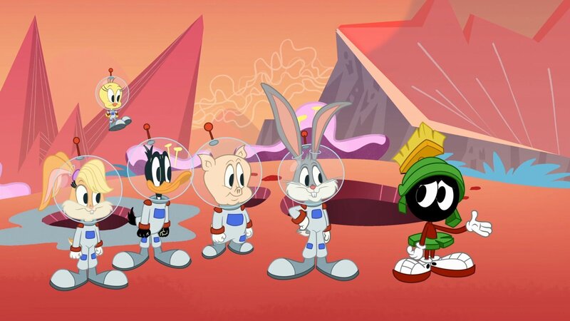 v.li.: Lola Bunny, Tweety, Daffy Duck, Porky Pig, Bugs Bunny, Marvin the Martian.