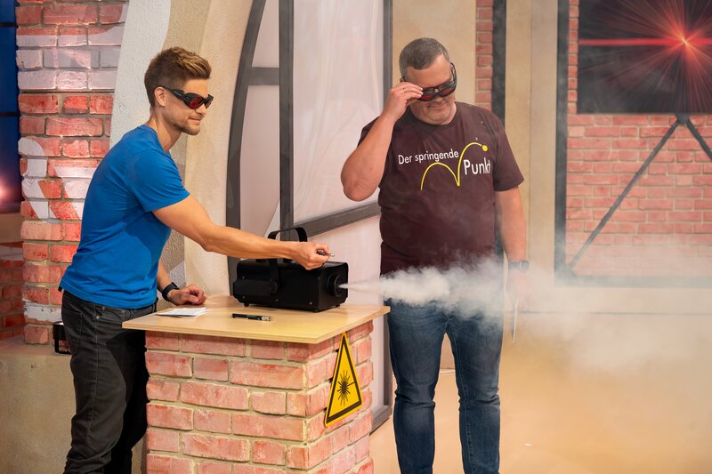 Der Physiker Dr. Philip Häusser (l.) präsentiert Elton ein spannendes Experiment mit Laserpointern.