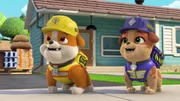 Hans Hammer filmt Rubble und seine Crew bei der Arbeit in der Bau-Bucht. Die Bauhunde helfen Herrn Klingeling, sein Haus zu versetzen, damit er es nicht mehr so weit hat.