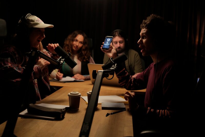 Beim "Swipe der Woche" verschafft ihr bester Freund und Co-Moderator Mo (Kayd Wacays, r.) Klara (Darin Hagi, l.) ein Match auf einer Dating-App. Auch Safiya (Nedja Bouzaida, 2.v.l.) und ihr Techniker (Kim-André Aspen, 3.v.l.) stellen sich dabei nur eine Frage: Was erwartet Klara bei ihrem Date?