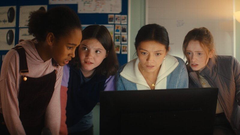 • Die vier Übriggebliebenen - Faye (Keira Chansa, l.), Isabel (Alis Waters, 2.v.l.), Charlotte (Frances Mayli McCann, 2.v.r.) und Bea (Aoife Hughes, r.) - entdecken auf dem Überwachungsvideo des Aliens, dass es alle 16 Minuten flackert - nur das Alien flackert, nicht der Hintergrund.