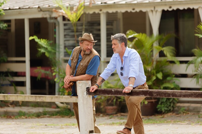 Alexis (Stéphane Blancafort, r.) und Sacha Laurent (Nicky Marbot, l.) stehen am Reitplatz und führen eine geschäftliche Unterhaltung, als sie unerwartet von einer unbekannten Frau gestört werden.