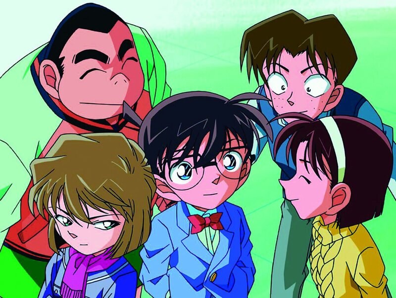 Um seine wahre Identität zu verheimlichen, muss Conan (M.) wieder die Grundschule besuchen, wo er mit seinen Mitschülern Ayumi (r.), Genta (l.), Mitsuhiko (2.v.r.) und Ai (2.v.l.) die Detective Boys gründet ...