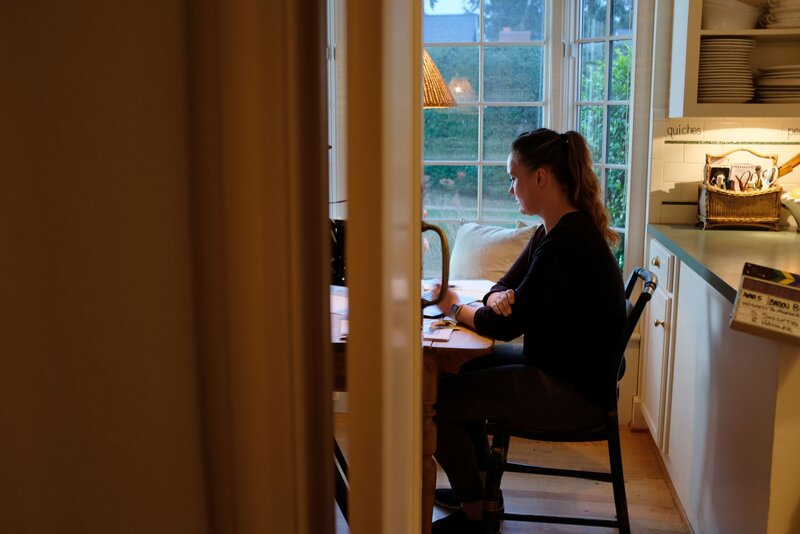 Die Frau sitzt am Tisch