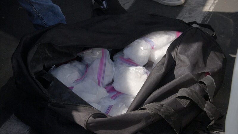Ein schwarzer Beutel mit mehreren Tütchen Methamphetamin wurde bei einem HSI-Einsatz in Orange County, Kalifornien, im Fahrzeug eines Verdächtigen entdeckt (National Geographic).