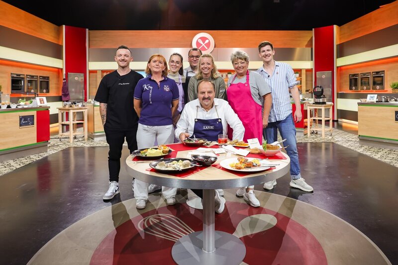 • Gruppenfoto von links: Kandidaten Richard Decker, Carmen Lamisch, Jennifer Schönrock, Marcello Ciarrettino, Moderator Johann Lafer, Jurorin Zora Klipp, Kandidaten Cornelia Uetrecht und Moritz Geschke