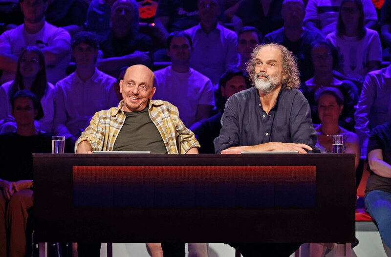 Rateteam-Kapitän Bernhard Hoëcker (l.) und der Musiker und Mitglied der "Shanty Rock"-Band "Santiano", Hans-Timm Hinrichsen (r.) bilden ein Rateteam.Bild: © ARD/Morris Mac Matzen