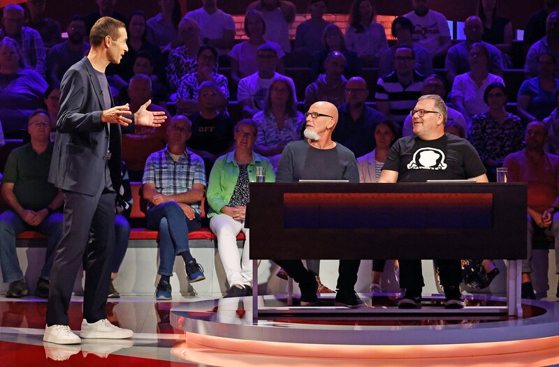 Moderator Kai Pflaume (l.) mit Rateteam-Kapitän Elton (r.) und dem Musiker und Mitglied der "Shanty Rock"-Band "Santiano", Björn Both (M.).Bild: © ARD/Morris Mac Matzen
