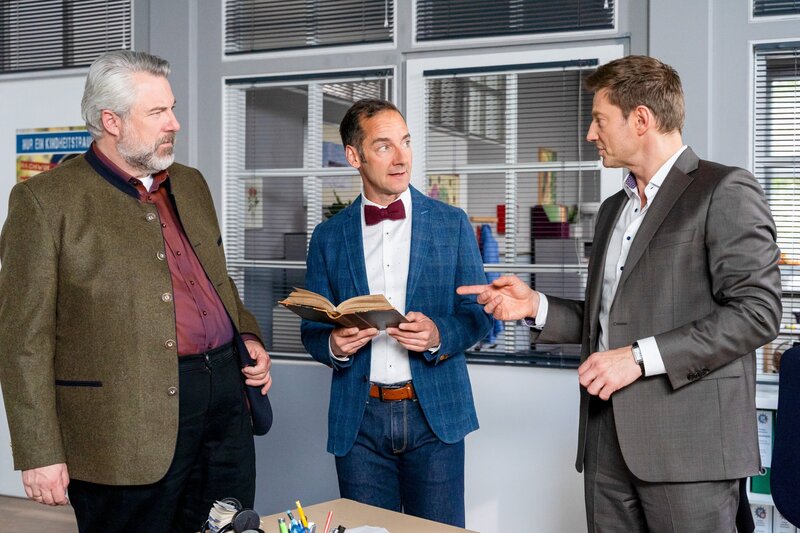 Kulturdezernent Dr. Frank Baumgartner (Oliver Bürgin, M.) kann für die Kommissare Stadler (Dieter Fischer, l.) und Hansen (Igor Jeftic, r.) die altdeutsche Chronik entziffern.