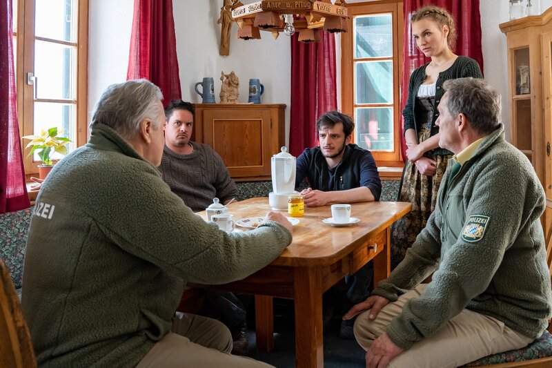 • Hubert (Christian Tramitz, r.) und Girwidz (Michael Brandner, l.) befragen die Familie des Toten: Ludwig (Leo Tramitz, 2.v.l.), Anton (Tommy Schwimmer, M.) und Anna (Christina Arends, 2.v.r.). Irgendetwas scheinen die Kinder des Verstorbenen zu verbergen.