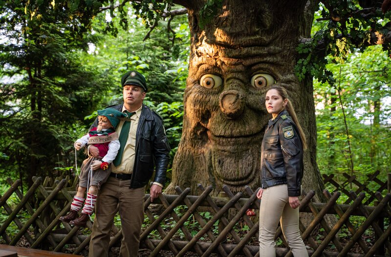• Ein Glück: Die Jungs haben nur eine Puppe auf dem Gewissen. Für Hubert und Girwidz heißt das jedoch: Der Mörder des Toten am Waldrand ist noch nicht gefasst. (V.l.n.r.:) Quirin Tauchfelder (Marinus Staber), Alois Jr. Tauchfelder (Sepp Staber), Franz Hubert (Christian Tramitz) und Reimund Girwidz (Michael Brandner).