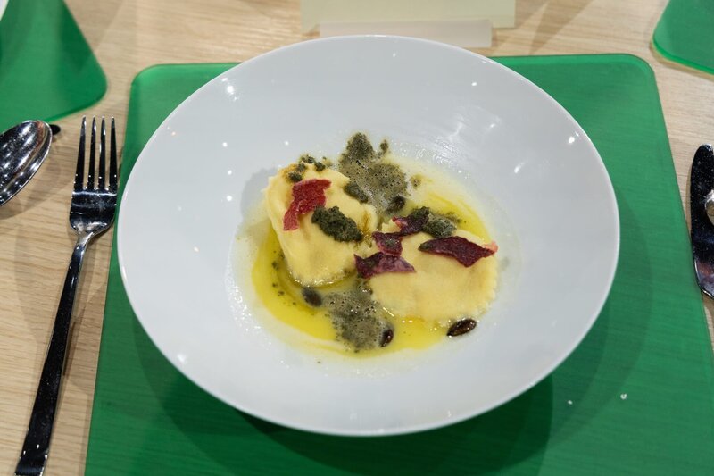 Tagesmotto "Vegetarisches Wintergericht": Kürbisravioli mit Parmesanbutter, Salbei-Schaum und Rote-Bete-Chips von Carla Weissbacher.Bild: © ZDF und Norman Kalle