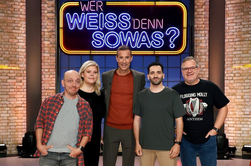 Moderator Kai Pflaume (M.) und seine Rateteam-Kapitäne Bernhard Hoëcker (l.) und Elton (r.) begrüßen in dieser Sendung die beiden Schauspieler*innen Marie Schöneburg (2.v.l.) und Hassan Akkouch (2.v.r.).Bild: © ARD/Morris Mac Matzen