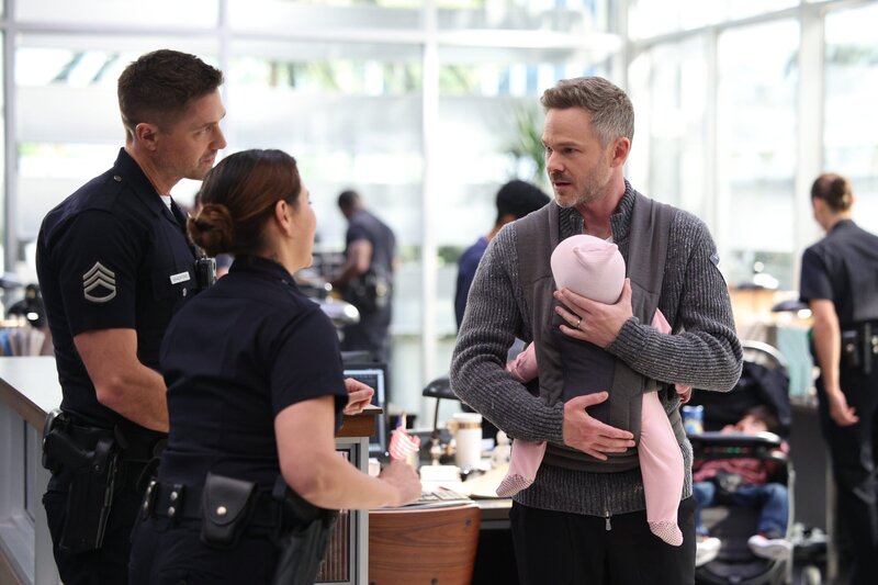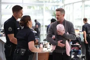 Officer Lucy (Melissa O'Neil, M.) und Tim (Eric Winter, l.) suchen bei Staatsanwalt Wesley (Shawn Ashmore, r.) rechtlichen Rat, als dieser zufällig mit seinem Kind auf der Polizeistation vorbeikommt.