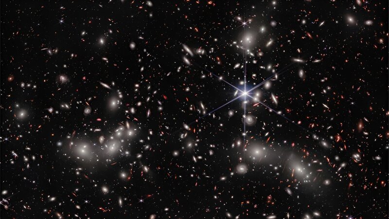 Dieses Bild zeigt eine Aufnahme des James-Webb-Teleskops von MACS0416, einen gigantischen Galaxienhaufen, der etwa 4,3 Milliarden Lichtjahre von der Erde entfernt ist.