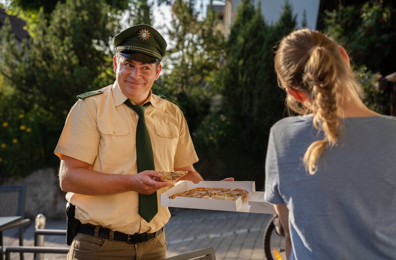• Hubert (Christian Tramitz, hinter, r.) und Girwidz (Michael Brandner, hinter, l.) konfrontieren Franziska Schäfer mit fehlerhaften Pizzaautomaten (Hannes Ringlstetter als Yazid, r.; Thekla Hartmann als Franziska Schäfer, l.)
