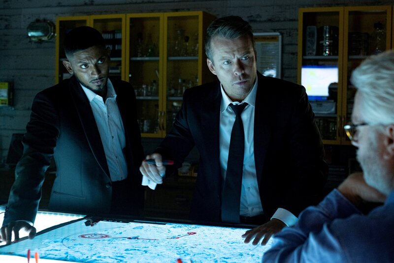 L-R: Sean Sagar as Special Agent DeShawn Jackson, Todd Lasance as AFP Liaison Officer Sergeant Jim 'JD' Dempsey and William McInnes as Forensic Pathologist Dr. Roy Penrose in NCIS: Sydney, episode 7, season 1, streaming on Paramount+, 2023.