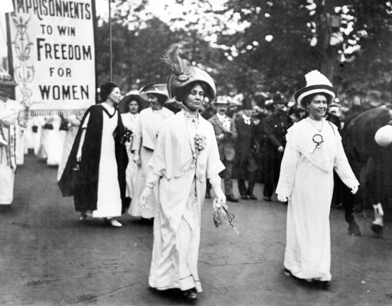 Lady Pethick-Lawrence (r.) und Mrs. Pankhurst führen eine Suffragetten-Demonstration an, Christabel Pankhurst (in schwarz-weiß) folgt ihrer Mutter. Um 1910.