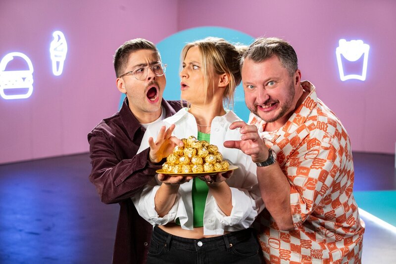 Die besseresser Lilly Temme (M.), Sebastian Lege (r.) und Florian Reza (l.) setzen sich in einer neuen Show für die ZDF Mediathek kritisch mit Ferrero Rocher auseinander: Was steckt wirklich in der goldenen Kugel?