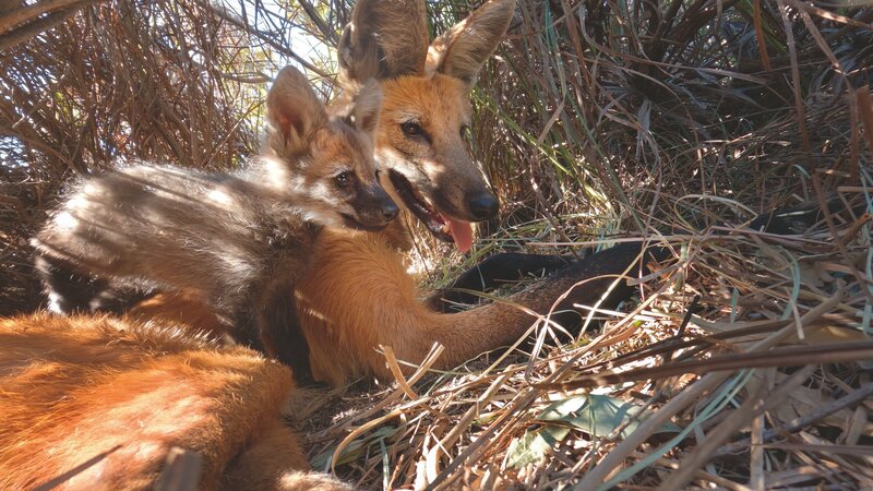 In Brasilien ist es Wissenschaftlern gelungen, mit versteckten Kameras zum ersten Mal junge Mähnenwölfe mit ihrer Mutter zu filmen.