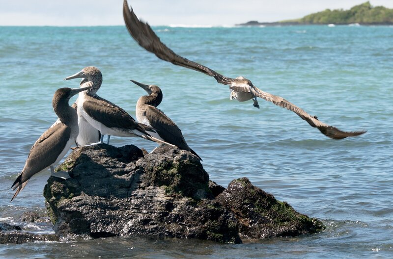 Vier Blaufußtölpel auf einem Felsen im Ozean