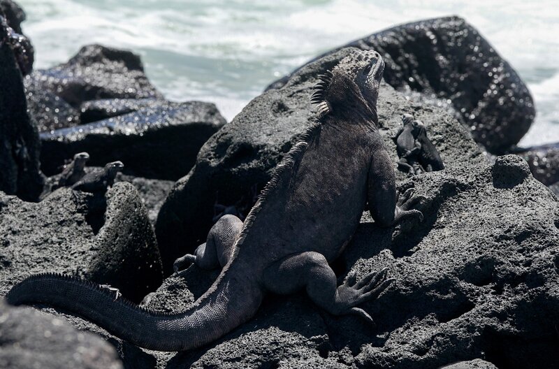 Meerechsen sonnen sich auf vulkanischen Felsen in der Nähe des Ozeans.
