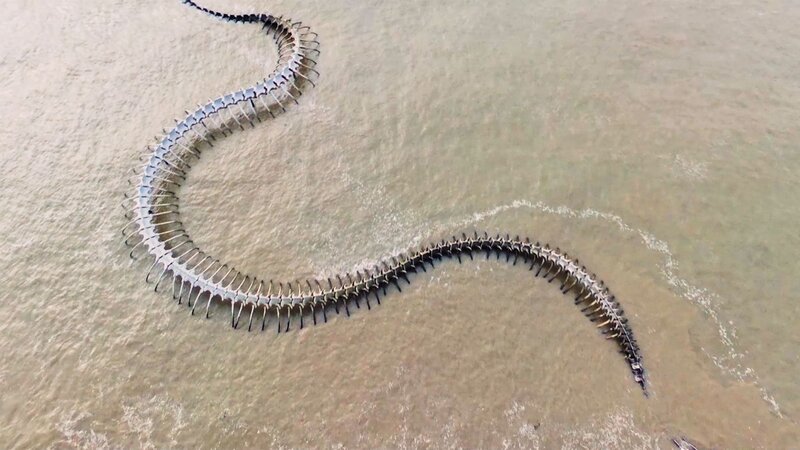Der Blick von oben offenbart die Skelettreste eines riesigen antiken Reptils. +++
