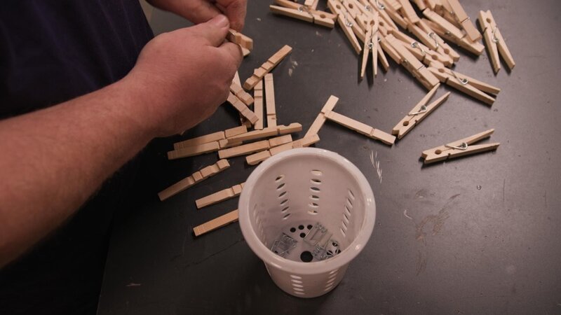 Teilnehmer entfernt Metallfedern von Holzpflöcken.