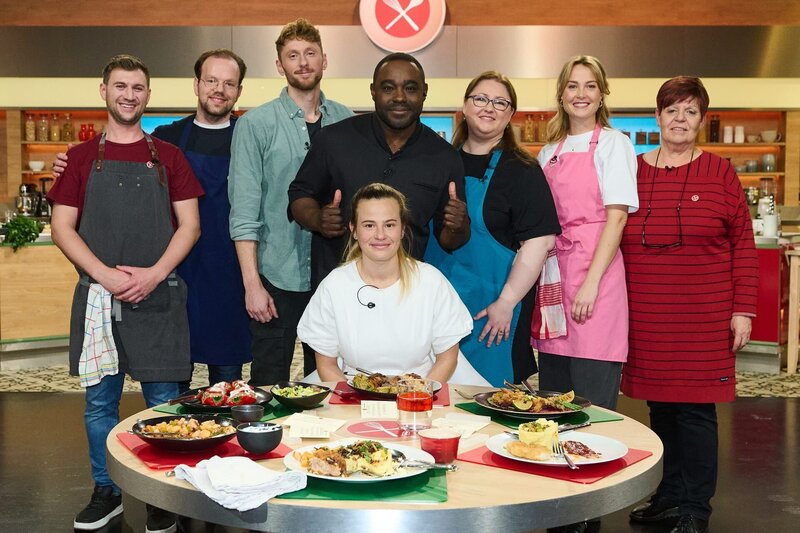 Gruppenfoto von links: Die Kandidaten Kevin Stranner, Philip Hackl, Stefan Potenberg, Jurorin Milena Broger, Moderator Nelson Müller, die Kandidaten Romana Wilmsmann, Greta Böske und Ursula BänschBild: © ZDF und Gunnar Nicolaus